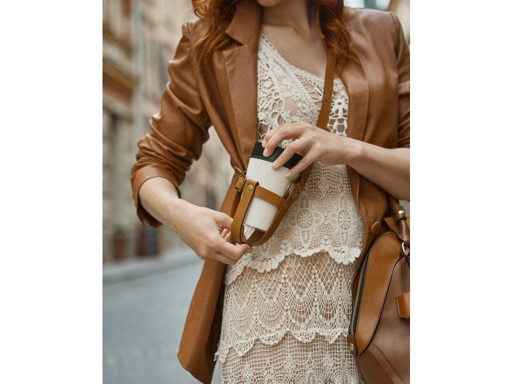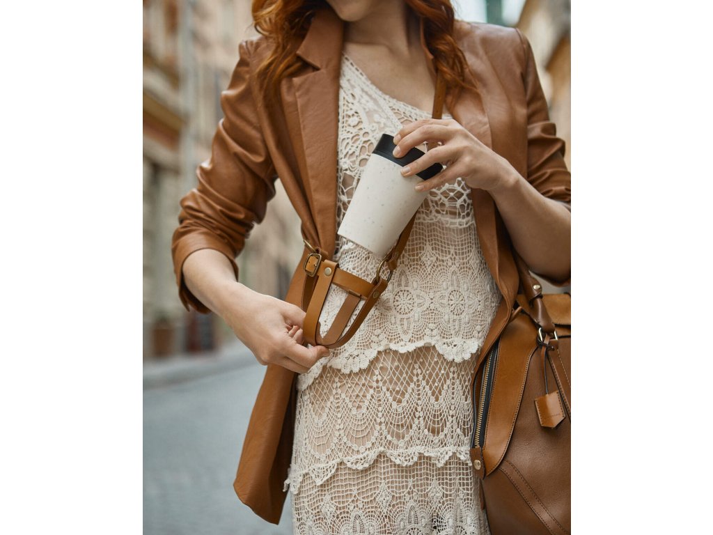 Štýlový univerzálny držiak z kožených popruhov na kávové termohrnčeky CIRCULAR&CO.