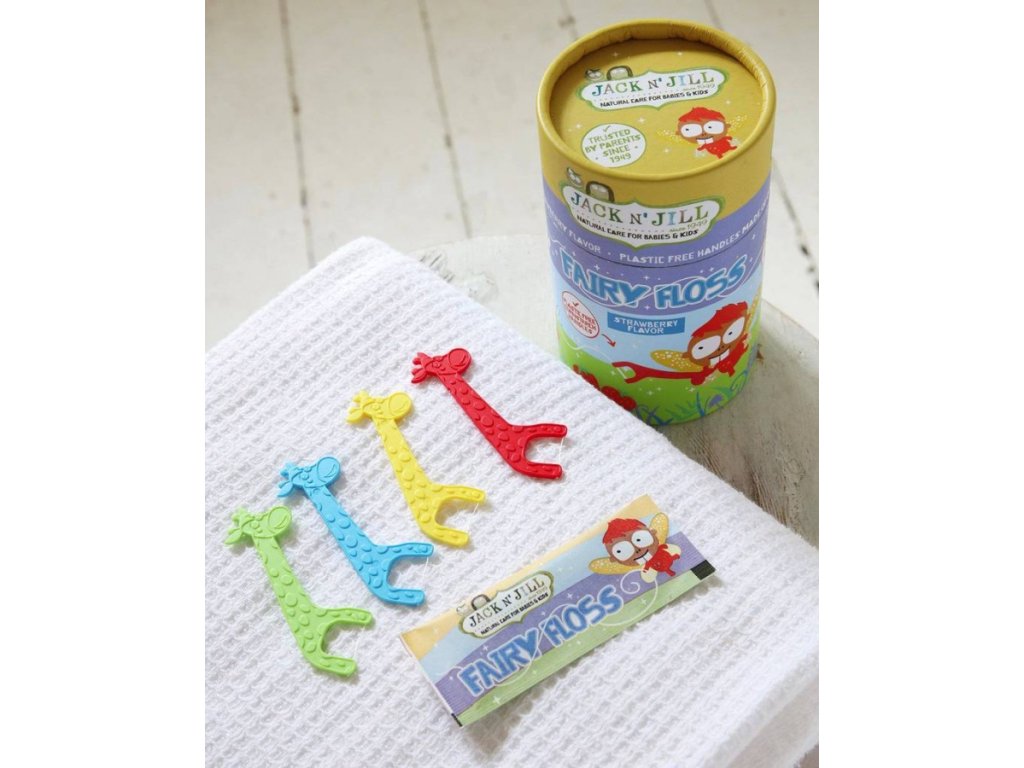 S rukoväťou v tvare žirafky vyrobenou z kukuričného škrobu a jemnou jahodovou príchuťou naučíte svoje deti používať niť raz-dva.