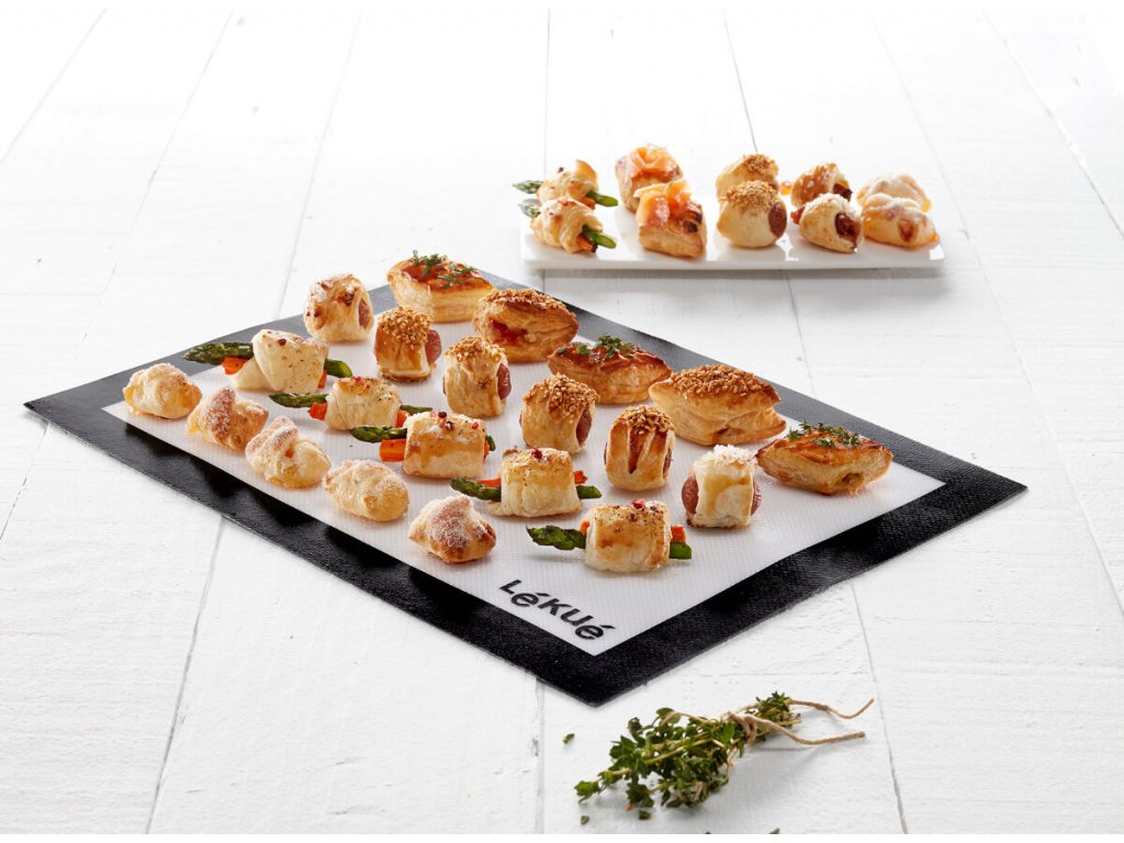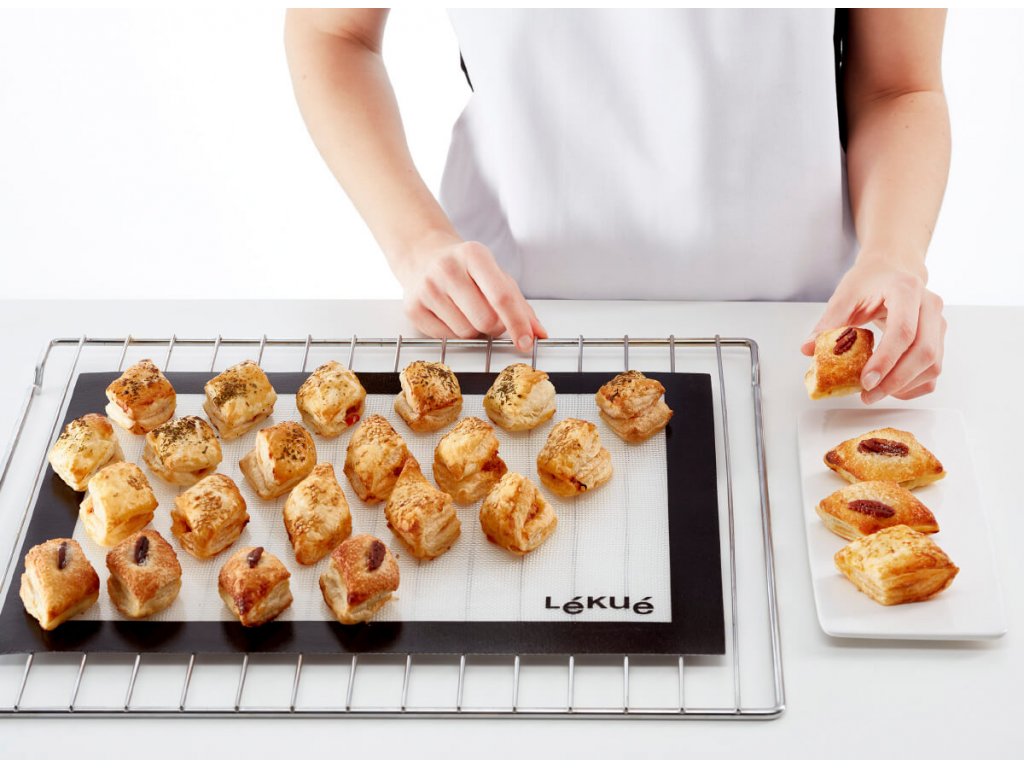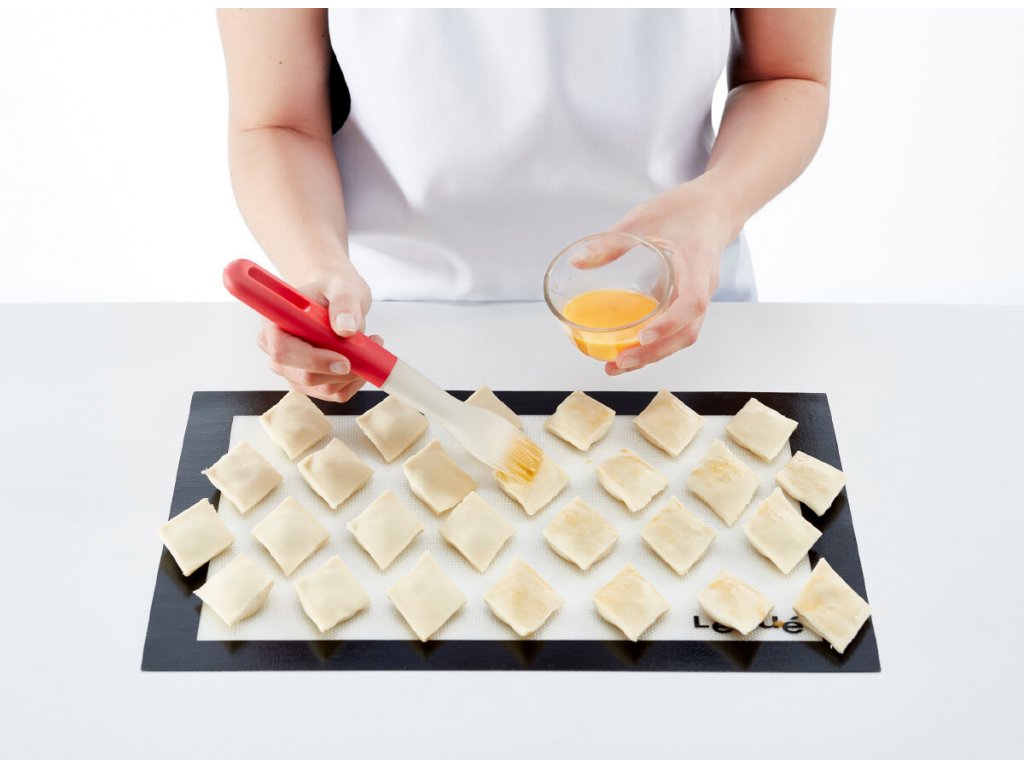 Podložka na prípravu a pečenie koláčov zo silikónu a skleneného vlákna. Použitie takejto kombinácie materiálov znamená, že cesto sa naň neprilepí a podložka sa ľahko čistí.